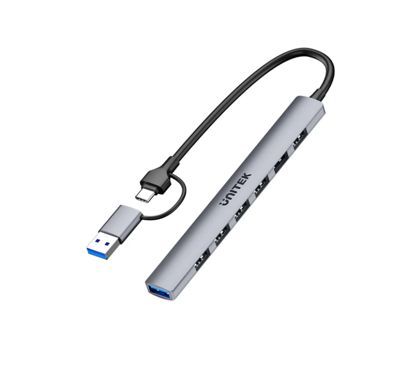 Unlock your devices with the UNITEK uHUB S7, a 7-in-1 hub with speeds up to 5Gbps. This compact hub converts one USB-C port into seven USB-A ports, and the included USB-A adapter ensures compatibility with both USB-A and USB-C hosts. Ideal for professionals and students, the UNITEK uHUB S7 boosts productivity on the go.